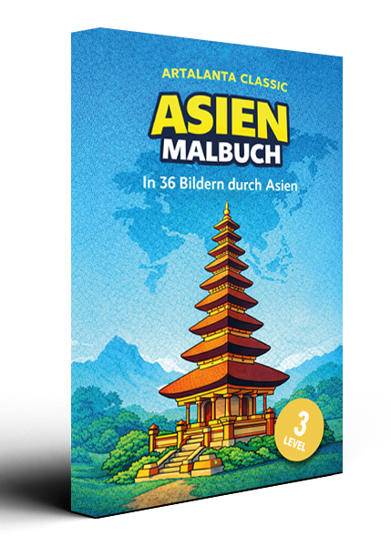 Das Asien-Malbuch lädt Kinder zu einer farbenfrohen Reise durch Kulturen, Traditionen und Natur ein – ohne Reizüberflutung, ohne Bildschirm.